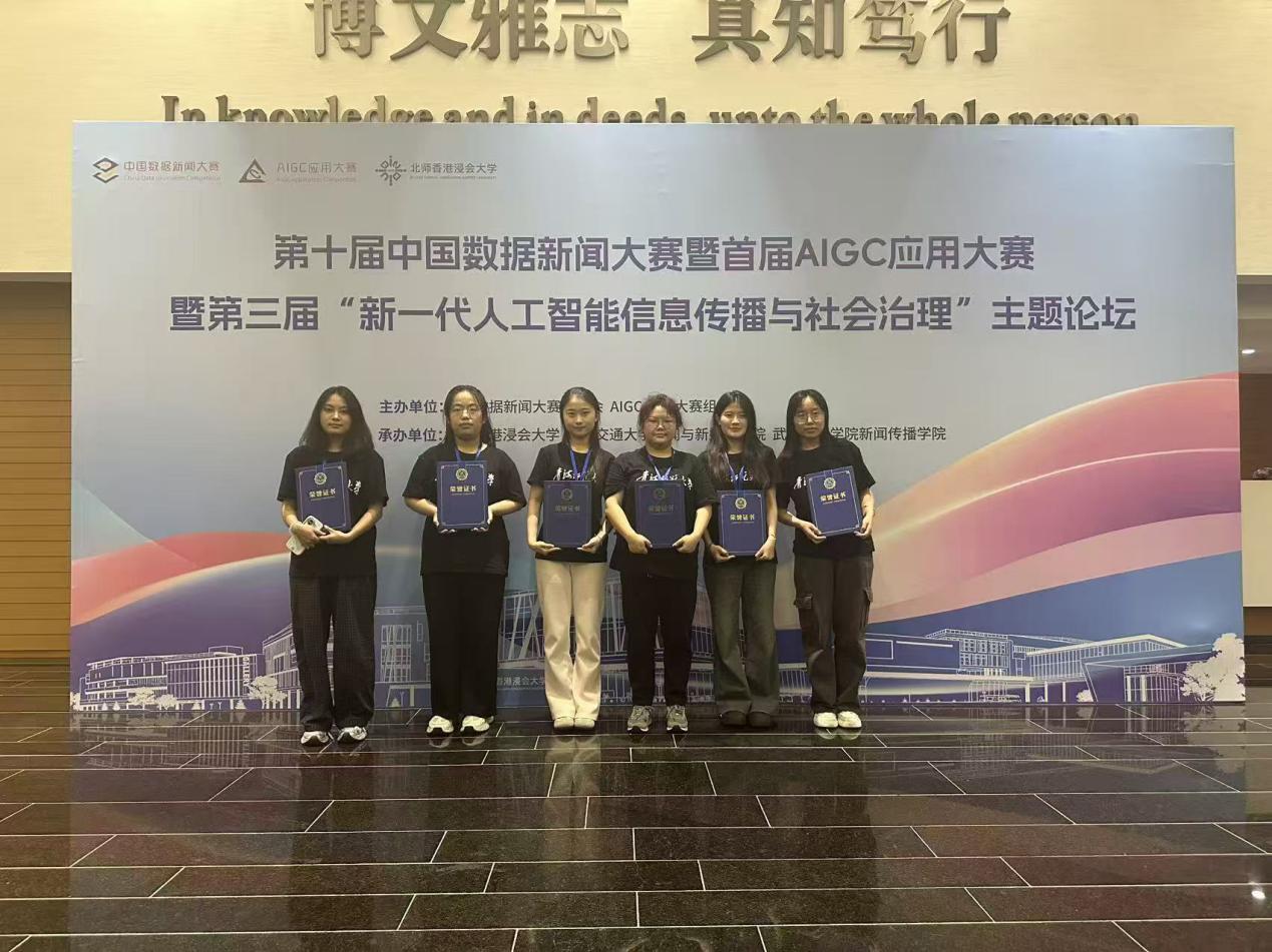 11月8日,第十届中国数据新闻大赛全国总决赛在广东省珠海市举行。新闻学院2023级新闻学专业本科生赵悦、严雅如、陈冬香、汪万英、郭雨漩、海田等6名学生在新闻学院教师庞书纬、陈雅琨的指导下,在众多优秀选手中脱颖而出,荣获大赛二等奖。